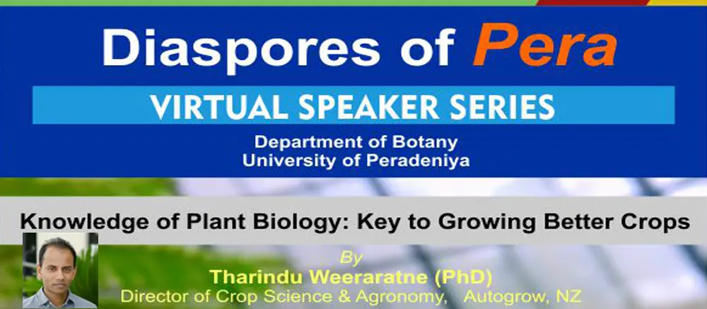 Please join us for the Department of Botany, University of Peradeniya Virtual Speaker Series this Sunday, August 16, at 09:00 a.m. for the seminar titled "Knowledge of Plant Biology: Key to Growing Better Crops" by Dr. Tharindu Weeraratne, Director of Crop Science and Agronomy, Autogrow, New Zealand.