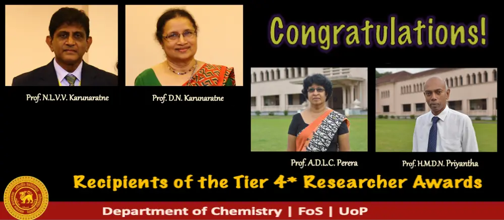In recognition of researchers of the University of Peradeniya who have fulfilled the requirements for the Tier 4* category, the Tier 4* Researcher Awards – 2020 organized by the University Research Council was held at the closing ceremony of iPURSE on the 12th of November 2021. We are pleased to congratulate the Tier 4* Researcher awardees, Prof. N.L.V.V. Karunaratne, Prof. D.N. Karunaratne, Prof. H.M.M. Priyantha and Prof. A.D.L.C. Perera from the Department of Chemistry, Faculty of Science. Congratulations on your well-deserved achievement.