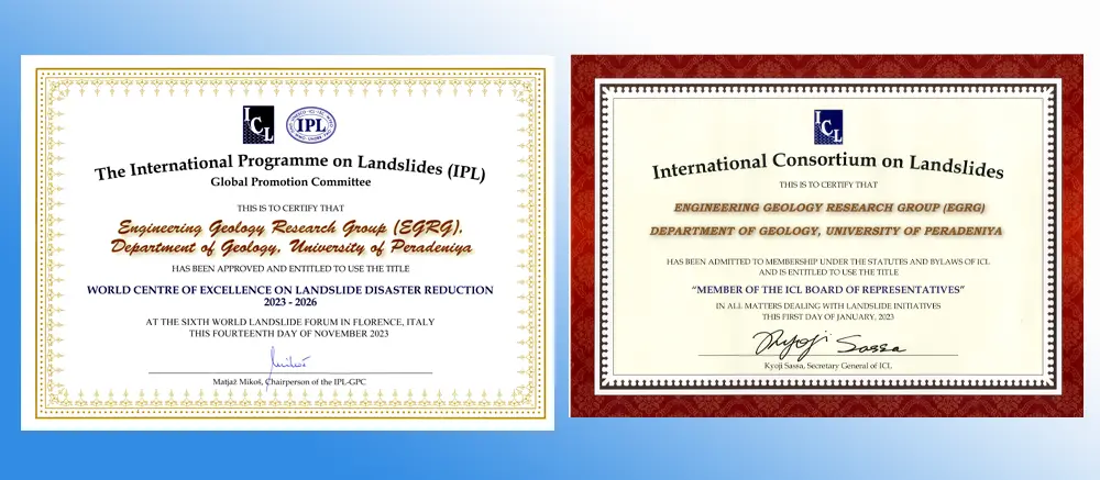 The Engineering Geology Research Team of the Department of Geology led by Dr. Jagath Gunatilake has received the recognition of the Center for Excellence in Landslide Research at the 16th World Landslide Forum in Florence, Italy, held from November 14 to 17, 2023.