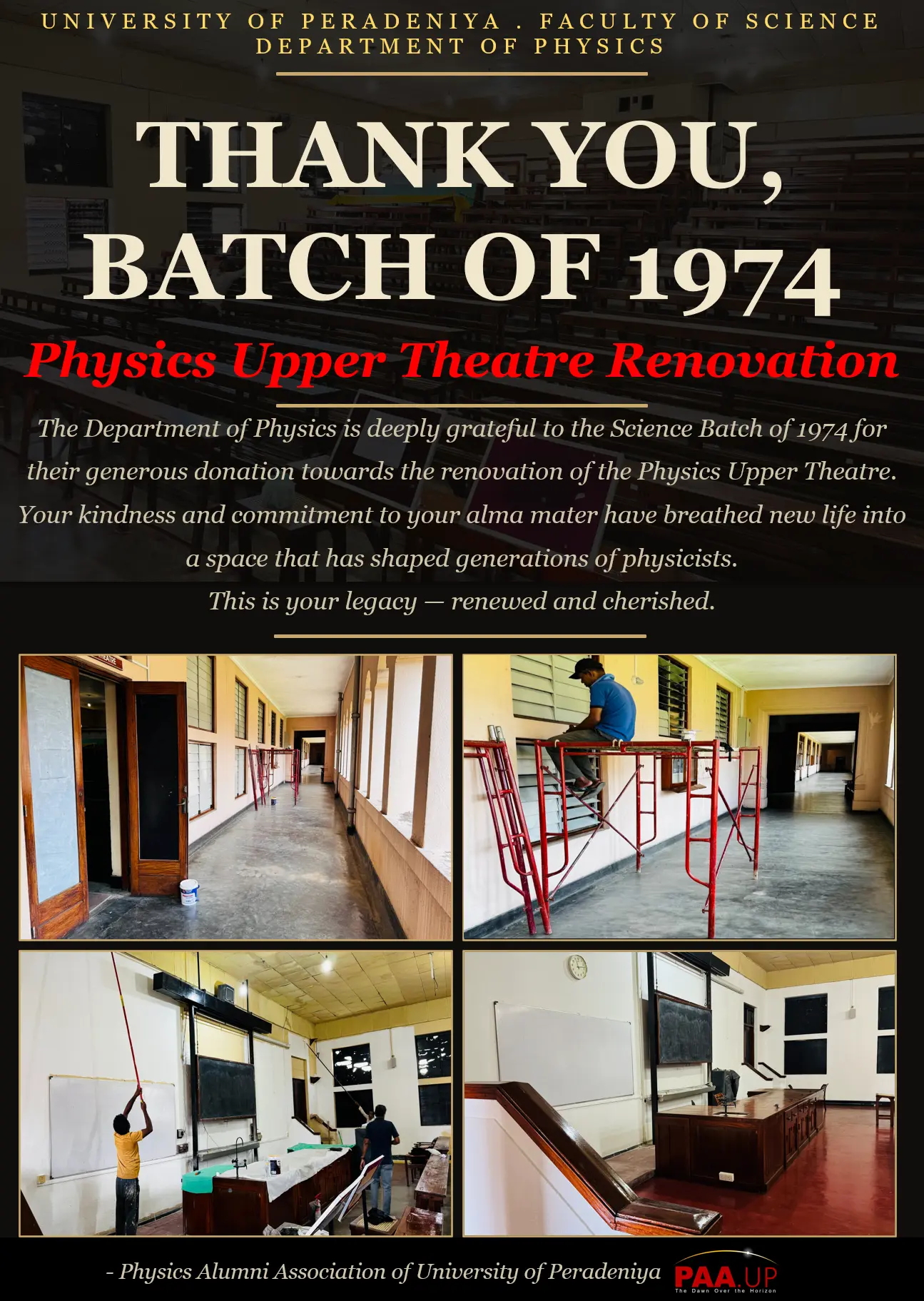 The Department of Physics is deeply grateful to the Batch of 1974 for their generous donation towards the renovation of the Physics Upper Theatre.