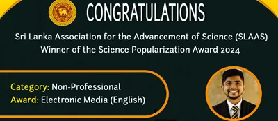 Mr. Buddheen Perera, Demonstrator (TA), Department of Physics, University of Peradeniya. Has won a Science Popularization Award for Electronic Media Non-Professional Category (English Medium) from SLAAS ...
