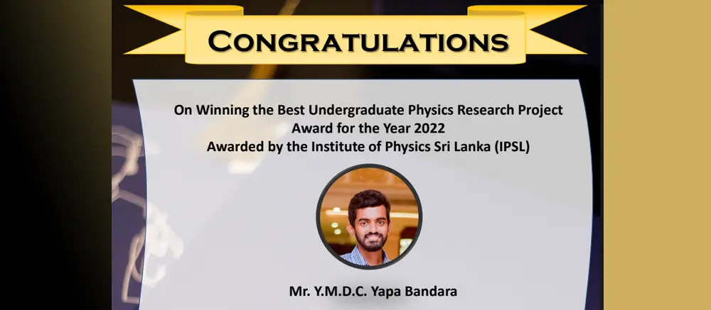 Mr. Dinuth Yapa Bandara is the winner of the “Best Undergraduate Physics Research Project Award - 2022”. The competition was organized by the Institute of Physics Sri Lanka, (IPSL) inviting applications from all the graduates from Sri Lankan universities who have obtained the degree within the period of 30 th December 2020 to 29 th December 2021. For the third consecutive year we are receiving this award, which highlights the standard of our Honours Study Programme in Physics.