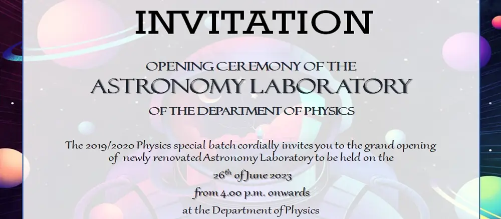 The Department of Physics cordially invites you to the grand opening of the newly renovated Astronomy Laboratory. The renovation project was undertaken by the 2019/2020 Physics Special batch with the aim of having a designated laboratory for Astronomy practicals and projects.
