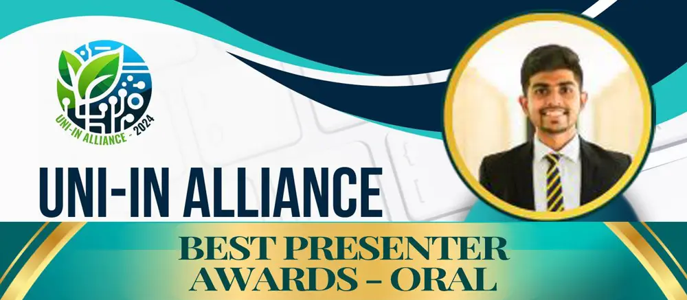 Mr. D. D. Buddheen Perera won the "Best Presenter" award in the Theoretical and Applied Physics Oral Session at the UNI-IN ALLIANCE Research Symposium 2024, held on the 16th of August 2024, organized by the Society of Industrial Scholars, University of Sri Jayewardenepura. His research, titled "Neutron Activation Analysis to Determine Isotopes of Elements in Portland Cement using Delayed Gamma Emission" was supervised by Dr. J. A. C. P. Jayalath and Dr. D. R. A. Mendis from the Department of Physics, Faculty of Science, University of Peradeniya.