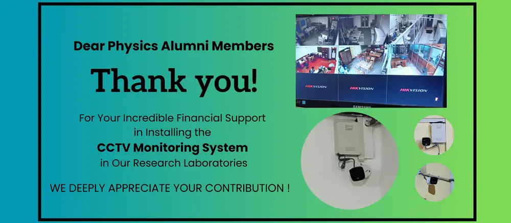 The Department of Physics extends its sincere thanks to our alumni for their generous financial contributions, which have made the installation of the CCTV monitoring system in our research laboratories possible.