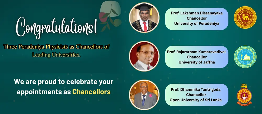 We are proud to announce that three emeritus professors of Physics, who obtained their B.Sc. (Physics Major) degrees from the Department of Physics at the University of Peradeniya, are presently holding the Chancellor positions of three leading Sri Lankan universities.