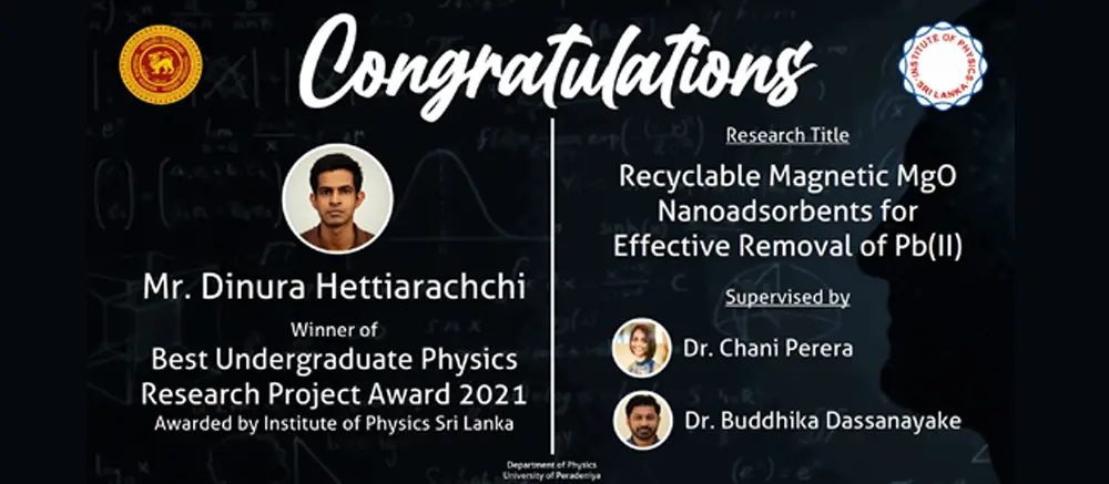 Mr. Dinura Hettiarachchi is the winner of the “Best Undergraduate Physics Research Project Award - 2021”. The competition was organized by the IPSL (Institute of Physics Sri Lanka) inviting all the Graduates from Sri Lankan Universities who have obtained the degree within the period of 01 March 2019 to 15 March 2021.